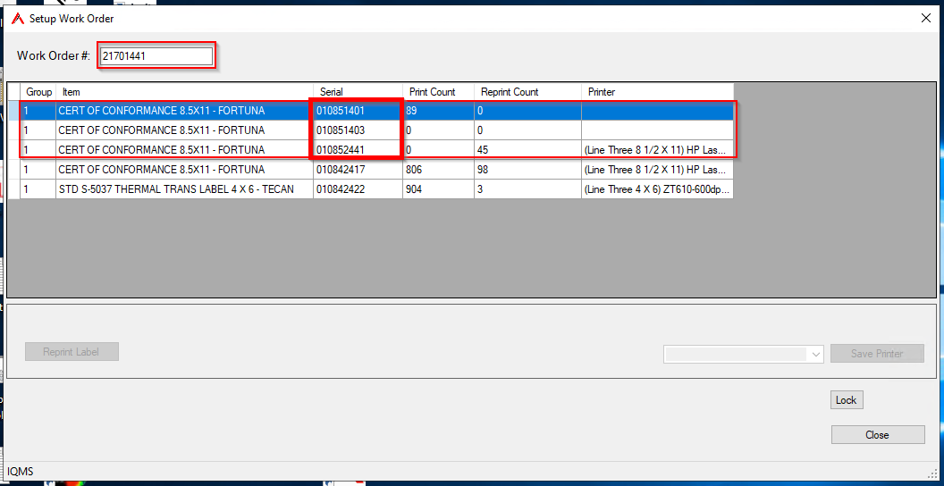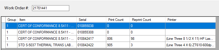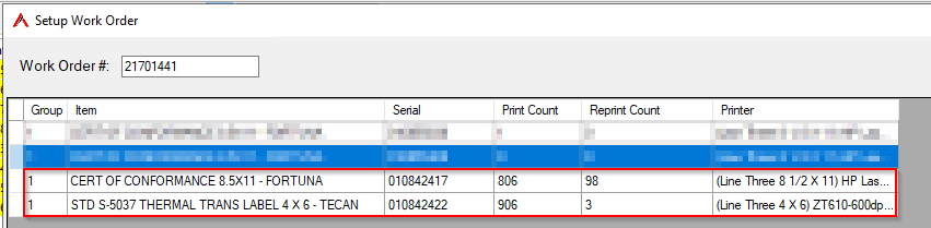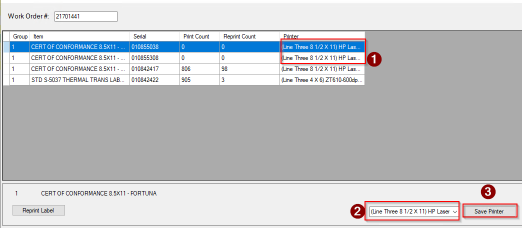 In the example below, too many CERT OF CONFORMANCE 8.5x11-FORTUNA labels have been printed, and some of the lines do not have printers selected. Both of these issues can cause problems with CVS.