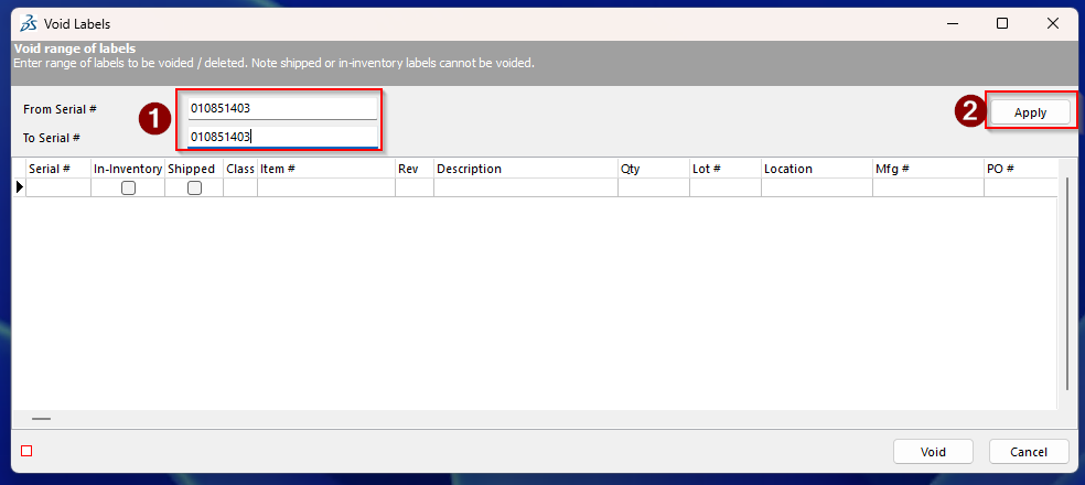 6. You will need to void each serial number individually.