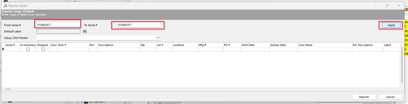 Enter the serial number into both the From Serial Number and To Serial Number fields, then click Apply.