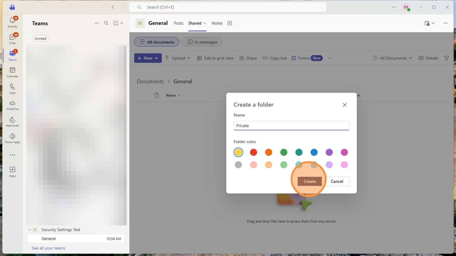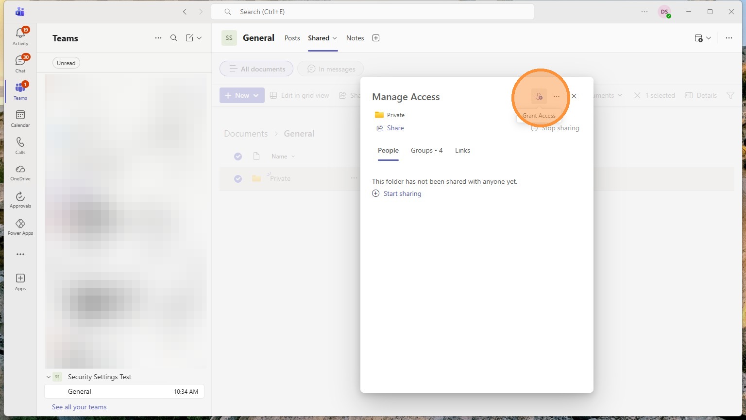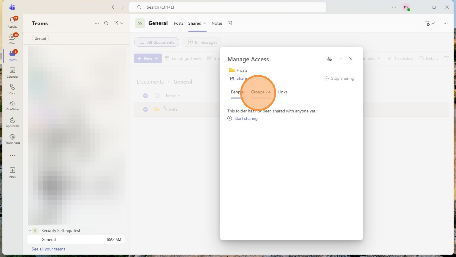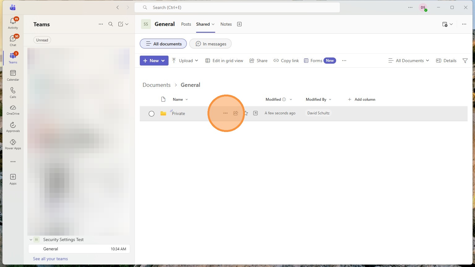 Any folders in here can have their own custom privacy settings. Anything in here will start with the teams privacy settings though.