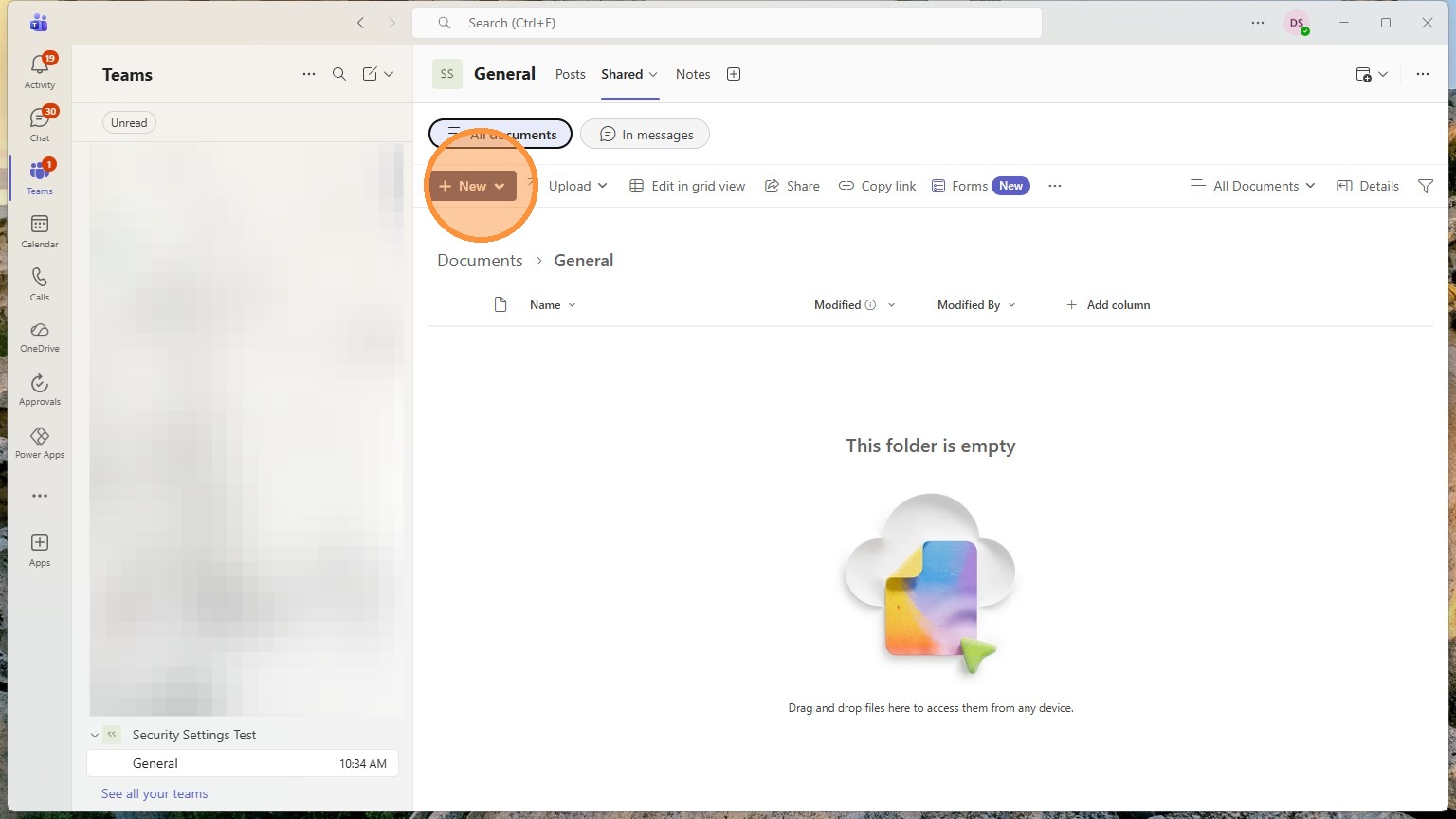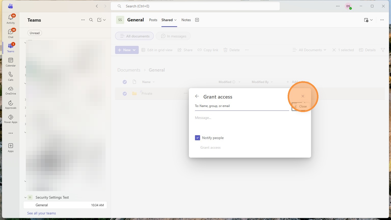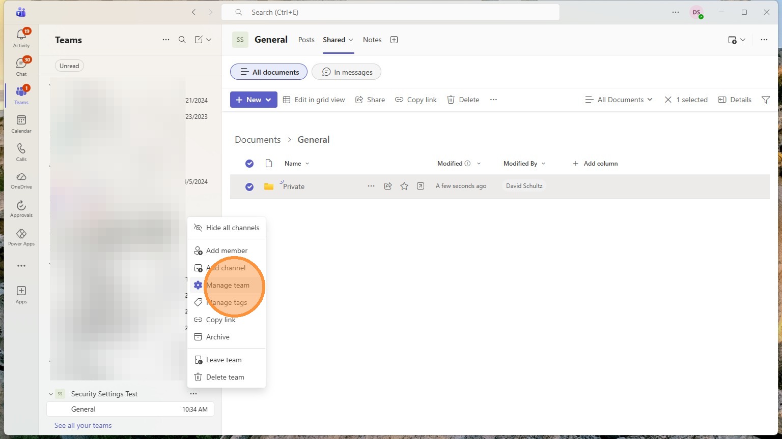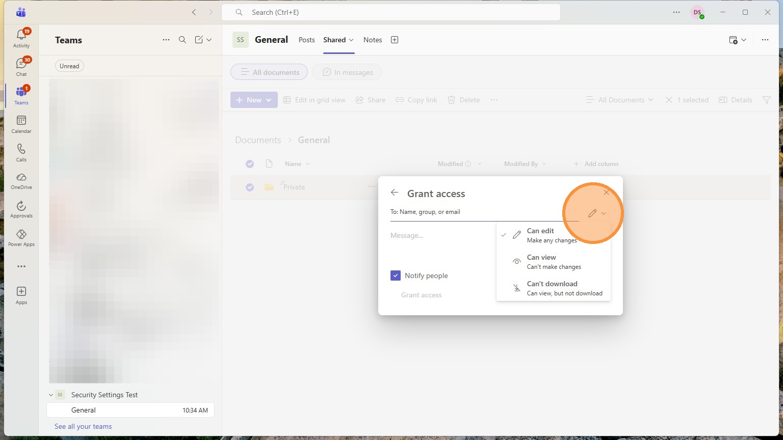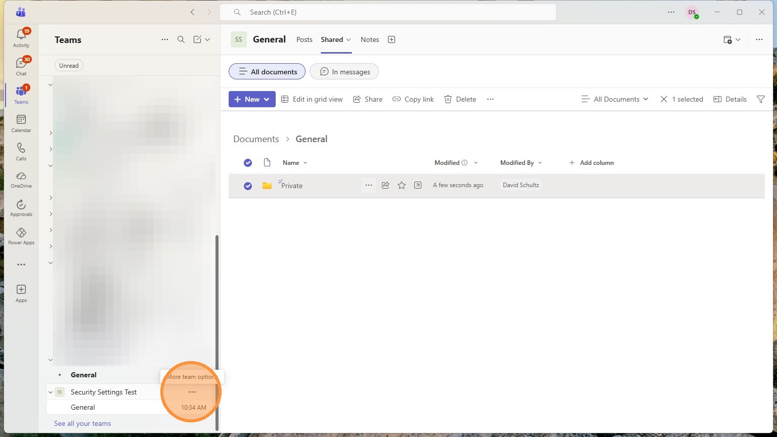 Any folders in here can have their own custom privacy settings. Anything in here will start with the teams privacy settings though.